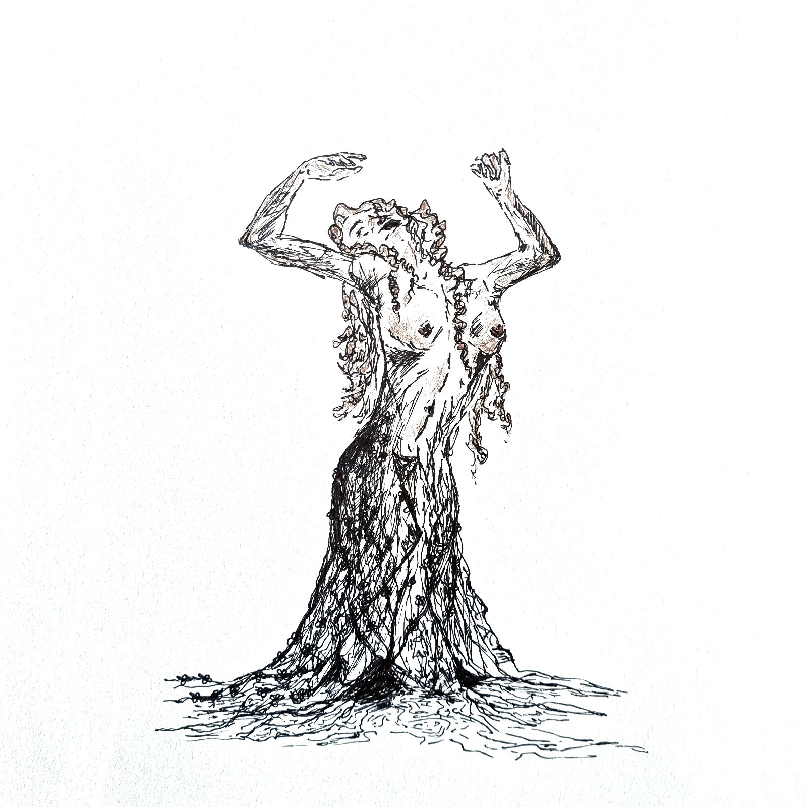 terrifying yet exhilarating! Maria constantly pushes through that moment to create figurative, abstract, and intuitive art. She is inspired by Nature, the unconscious mind, and psychoanalysis, which is her main practice. She captures intuitively the human form and its features, which she discerns within real-life trees, and lets the elusive-to-the-mind unfold freely in pure abstraction. She draws with inks and acrylics on paper, canvas, and wood.