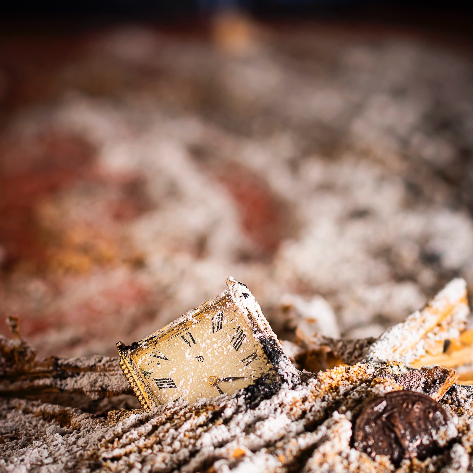 Part of the Aftermath series, Ashes of Time contemplates the residue of memory— what remains when all has burned away. A lone timepiece lies half-buried in warm terracotta dust and brittle white ash, surrounded by faint remnants of smoke. This image captures a moment suspended between past and present, life and trace. The faded gold of the watch, dulled by fire and erosion, echoes a time once treasured, now lost. Through controlled minimalism and symbolic staging, the work questions the permanence of what we value, suggesting that even time, when burned, leaves behind only fragile outlines. The piece invites reflection on the vulnerability of memory, the silence of what’s gone, and the quiet persistence of the things we leave behind.