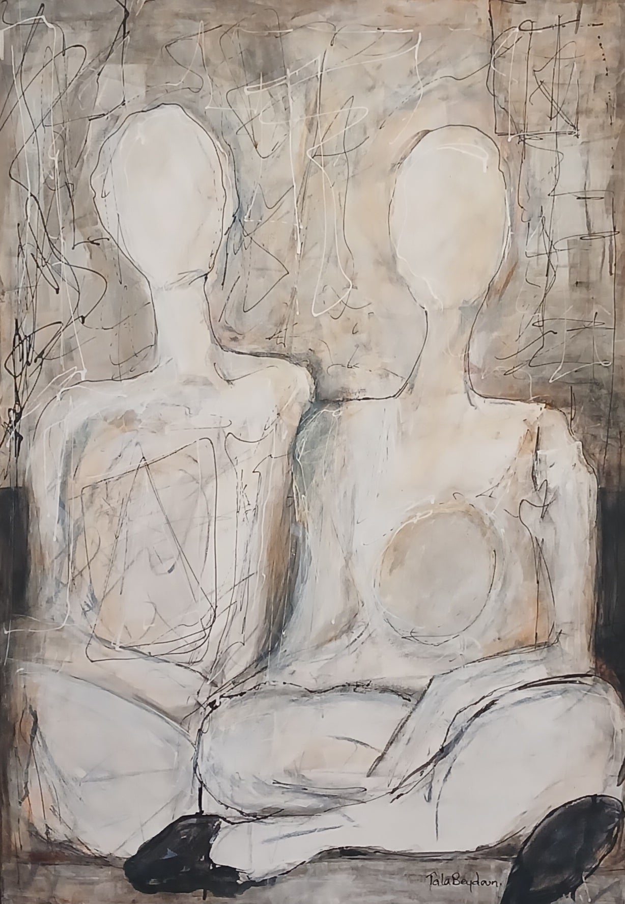 According to the Embodied Realities exhibition's curator Dr. Pamela Chrabieh, "In At the Mall, Tala Beydoun strips away the superficial layers of consumer culture to reveal the raw, faceless essence of human presence. Two figures sit side by side, their forms outlined in delicate, almost skeletal lines, yet their identities remain undefined. The muted palette and chaotic background suggest a space that is both familiar and detached—one of routine, anonymity, and quiet coexistence. The circular voids within their chests hint at absence, longing, or the hollow nature of material pursuits.