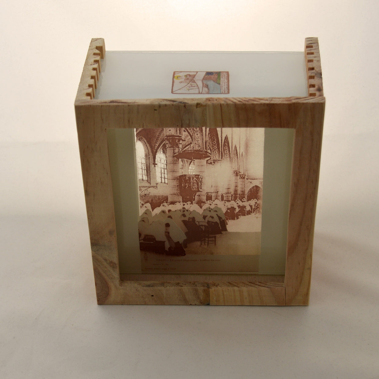 Using those photos from the image archive as starting material, I made some 3D viewing boxes. Each viewing box measures about 17 cm x 19 cm x 11 cm and contains 4 or 5 layers of glass. For this, I processed the photo material for use as kiln-fired photo decals in a 3D setting. I present here “ The Evening Service”, both the viewing box and the original historical photo that I used as starting material.