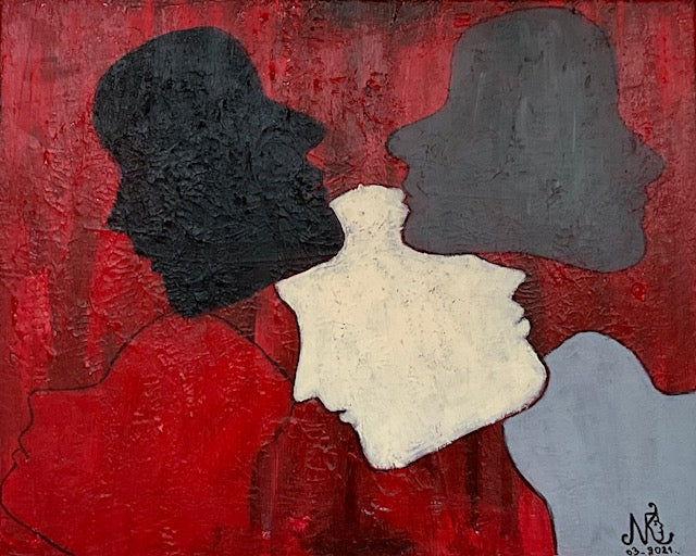 This piece explores the tension between presence and absence, identity and anonymity. The layered silhouettes, set against a textured red background, symbolize the struggle between connection and detachment in human relationships. The interplay between dark and light tones reflects the complexity of our embodied experiences, shaped by history, trauma, and personal narratives. Some figures appear solid, while others fade into the background, illustrating the fluidity of identity and the lingering presence of those who came before us. The work encourages viewers to contemplate how personal and collective histories shape our realities, aligning seamlessly with the Embodied Realities exhibition theme.