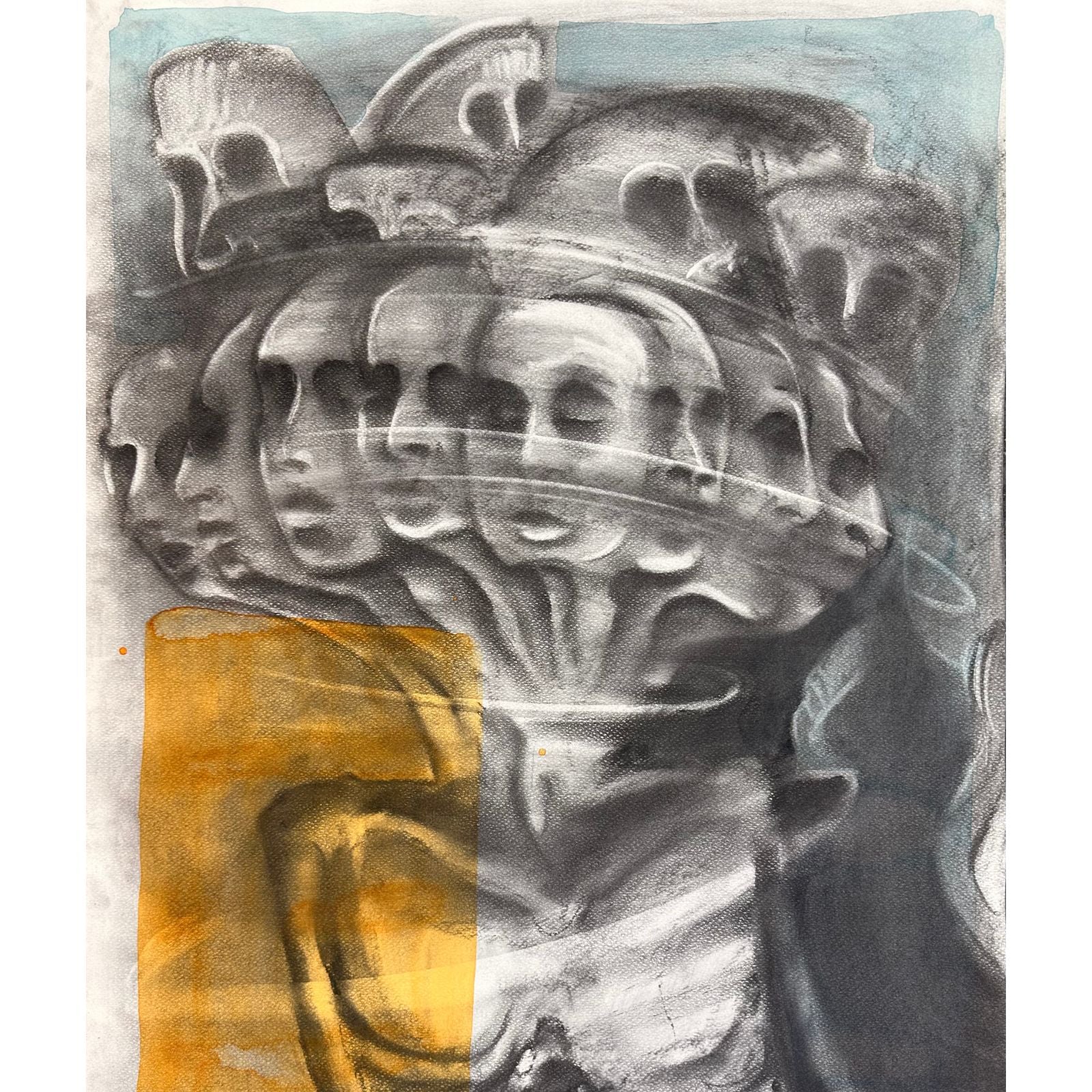 Echoes of Stress represents the impact of stress on the body, mind, and heart. The overlapping faces and distorted forms show how overwhelming thoughts and emotions can take a physical toll. The piece reflects the feeling of being trapped in a cycle of pressure, where the heart and mind are constantly racing, and the body carries the weight of that struggle. The use of charcoal adds to the rawness of the theme, emphasizing movement and tension. This artwork is a visual representation of how stress affects both our mental and physical states.