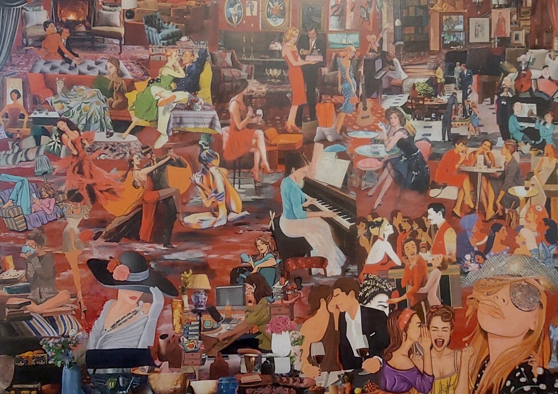 Her mediums are paper and glue, but the substrate could be anything – canvas, paper, cardboard, porcelain, glass, wood, or an object with a silent meaning…. She likes to use printed material for the images—somebody’s art – to be reused in a new venue. One particular image is the seed from which, one clipping at a time, a scene evolves to merge colors, style, people, things, and memories and bring life to her collages.