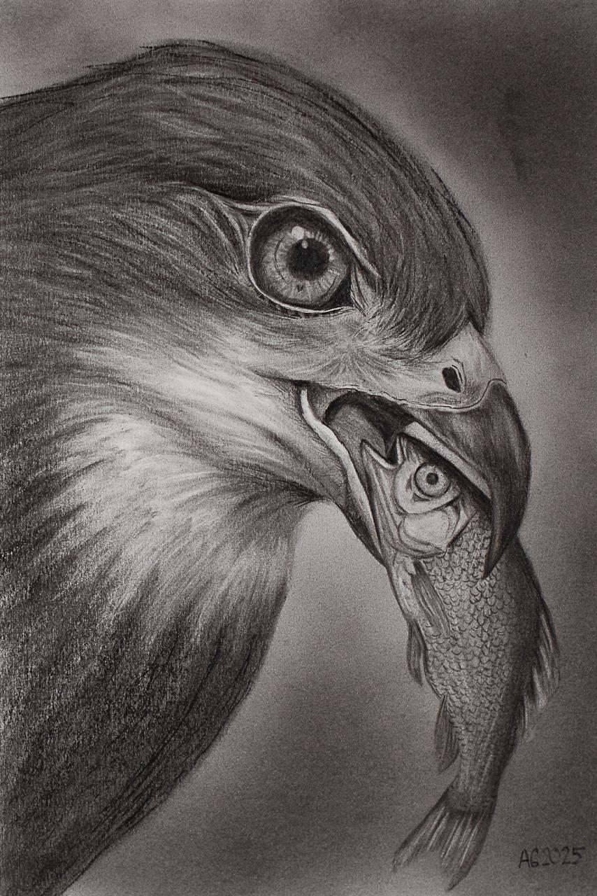 "The Exchange of Fate” portrays the fragile balance between survival and surrender. In the piercing gaze of the bird lies vitality and continuation, while the wide, fading eye of the fish reflects the quiet acceptance of life’s end. This moment, frozen in charcoal, reveals the eternal cycle where one life begins as another concludes.