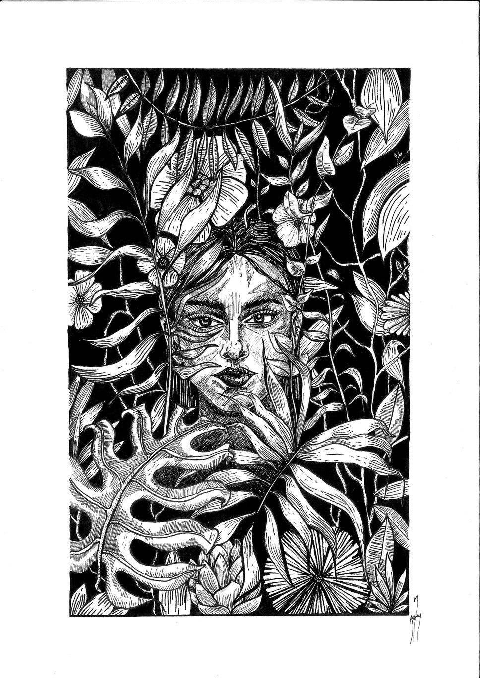 Fiora Lisa" is a captivating black and white artwork where a woman emerges from dense vegetation, her intense gaze challenging the viewer with profound assurance. This composition evokes the shared intuitive power between woman and nature. The monochromatic contrasts emphasize the enigmatic determination of the woman, akin to vegetation persisting and rebirthing in unexpected places. The scene celebrates feminine strength—gentle yet powerful, unpredictable yet resilient—while delving into the symbolism of the secret garden. "Fiora Lisa" in black and white offers a visual meditation on resilience, intuition, and inner strength, transcending the constraints of color palette to explore the mystery of a universal secret garden.