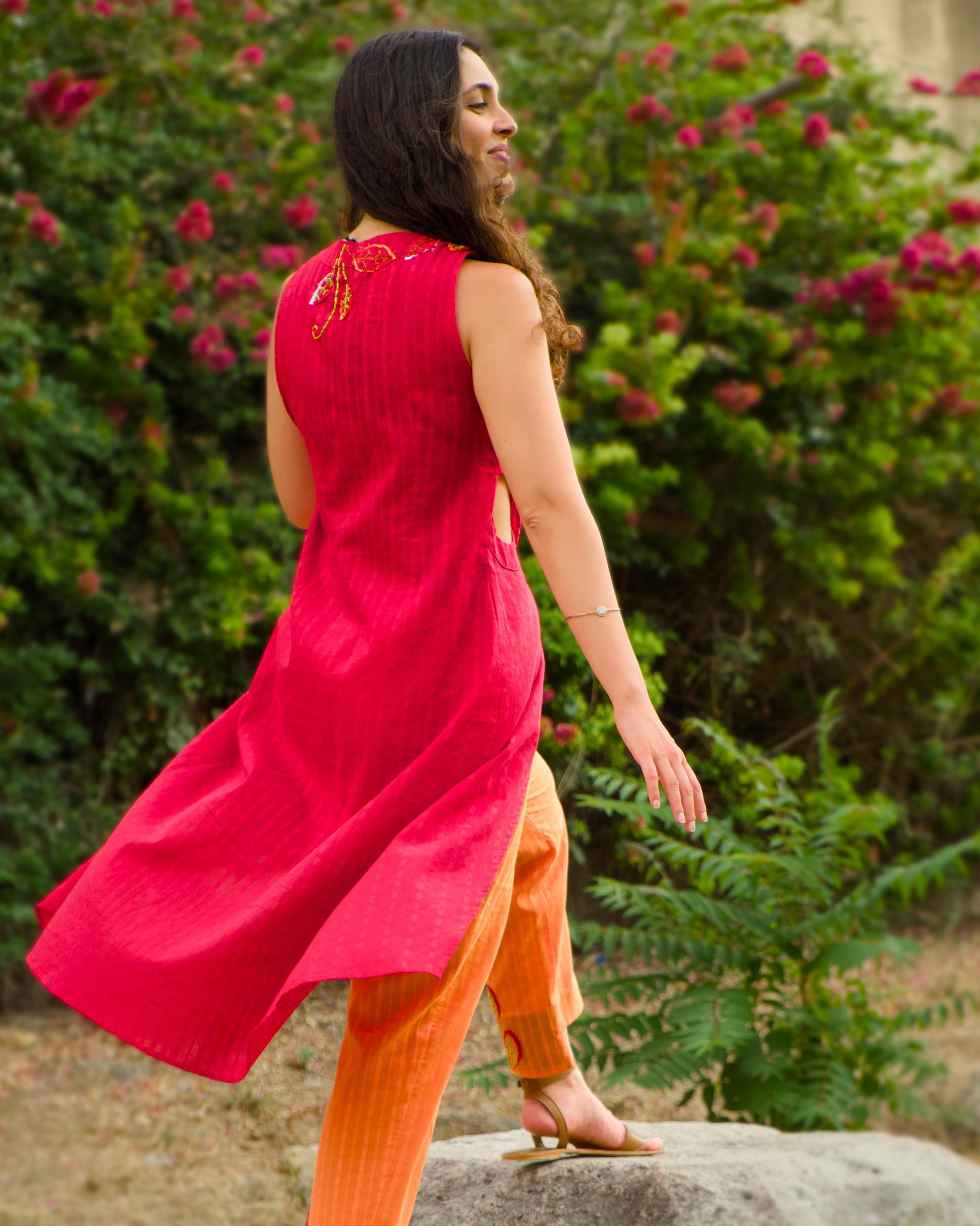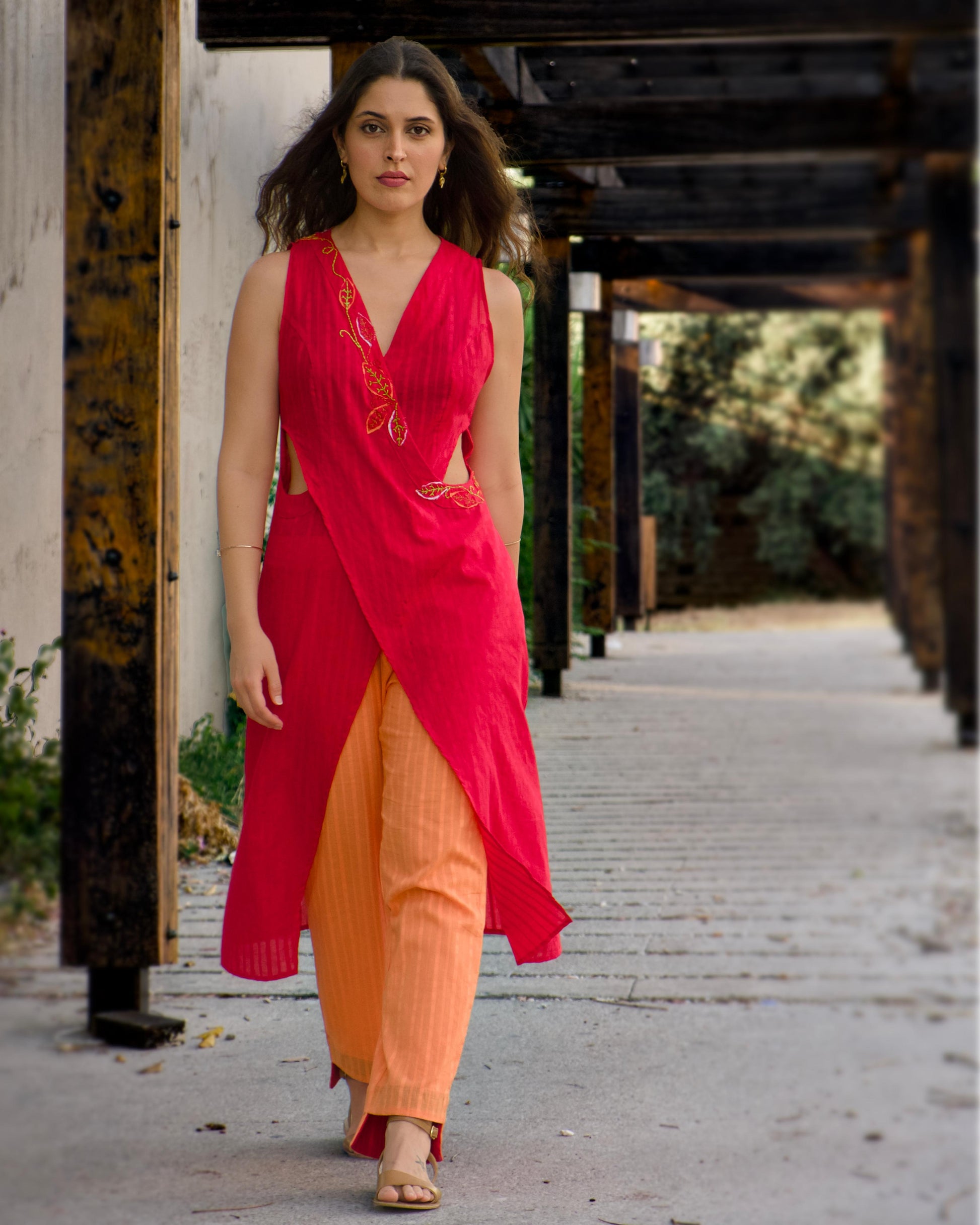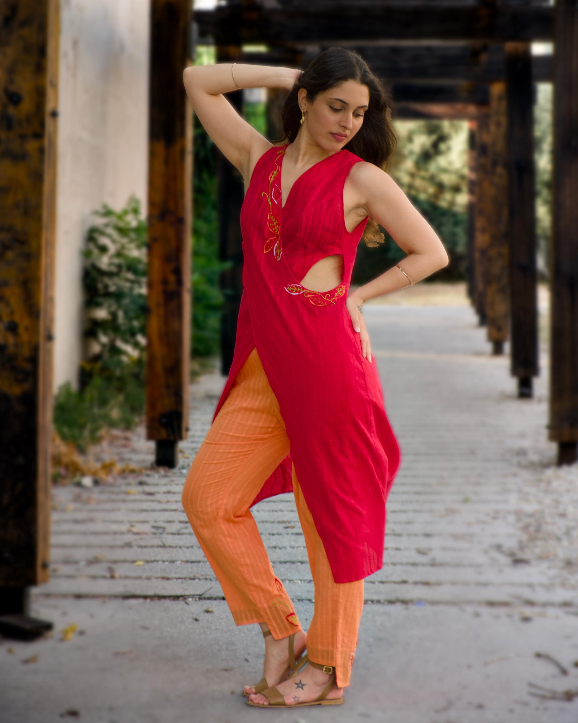 Bright orange with crimson red cotton textured fabric ensemble of two pieces, designed with leaves applique embroidery. Casual but never ordinary!