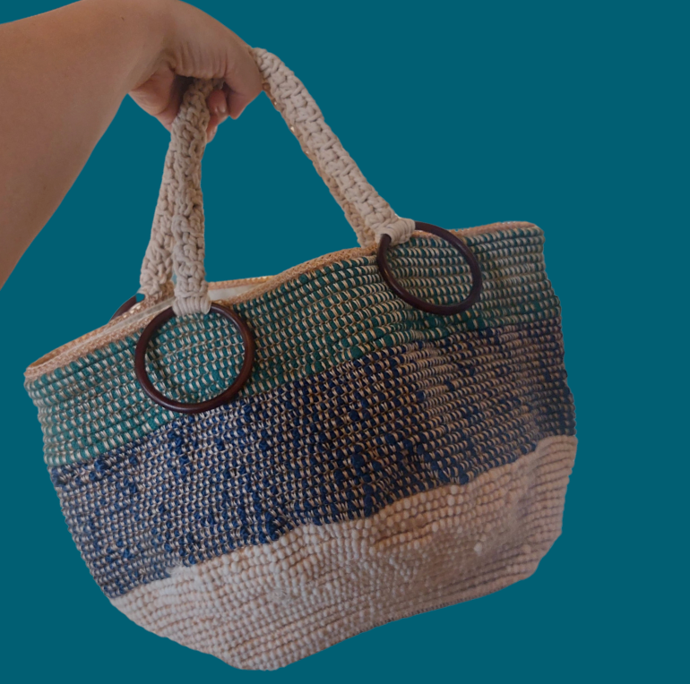 Claude's coastal-inspired creation combines crochet with woven rope handles and wooden rings. Durable, elegant, and made to stand out.