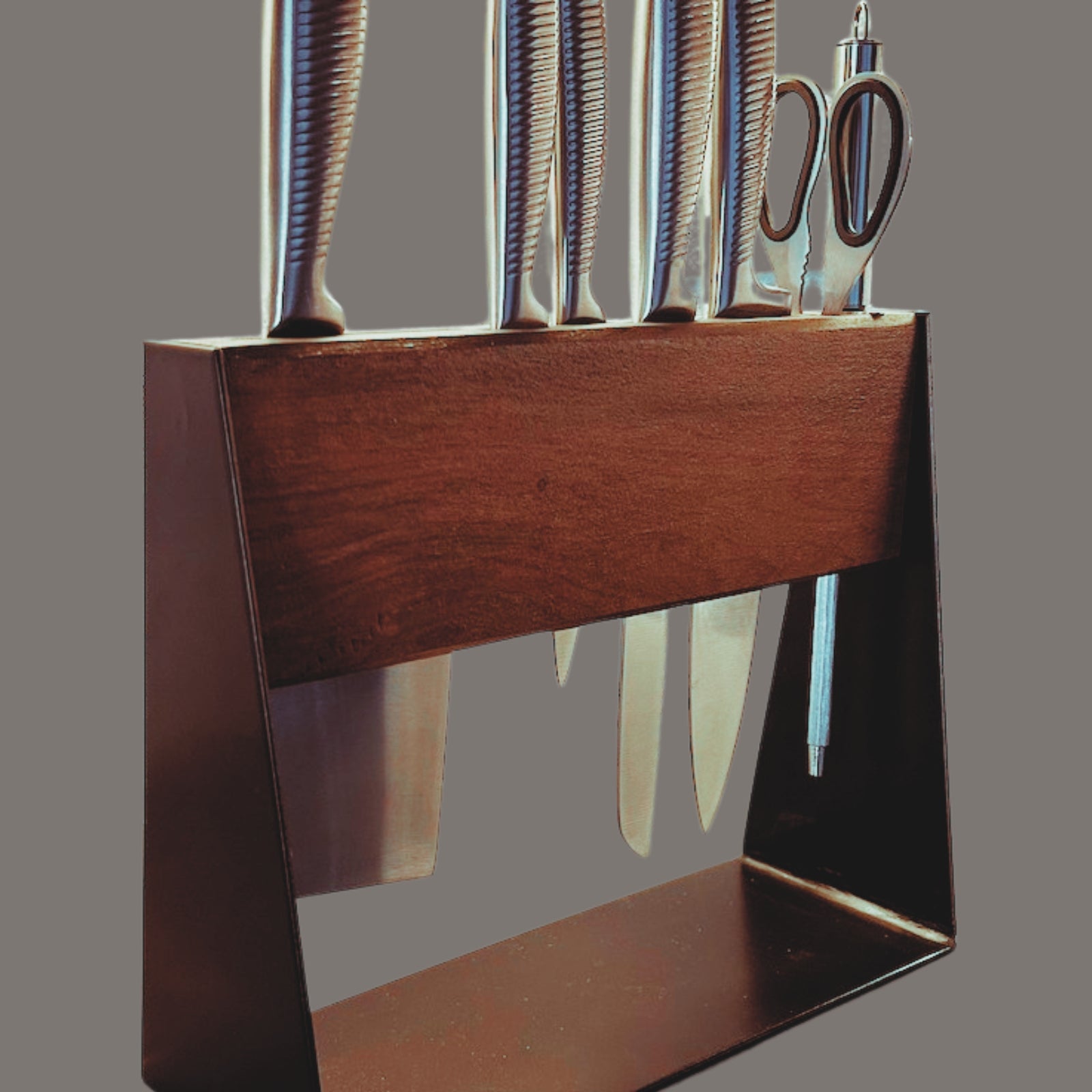 This handmade knife holder structure is a beautifully crafted piece of high-quality wood that combines functionality with aesthetic appeal. The holder features multiple slots for various sizes of knives and a dedicated space for scissors. The natural wood finish adds a touch of elegance, making it not just a utility item but also a stylish countertop accessory. Perfect for those who appreciate craftsmanship and thoughtful design in their kitchen essentials.