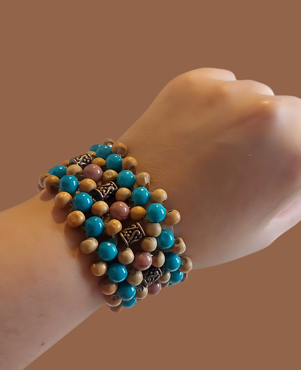 Bracelet crafted with bead weaving, featuring wooden beads, blue and purple ceramic painted beads, and copper beads.