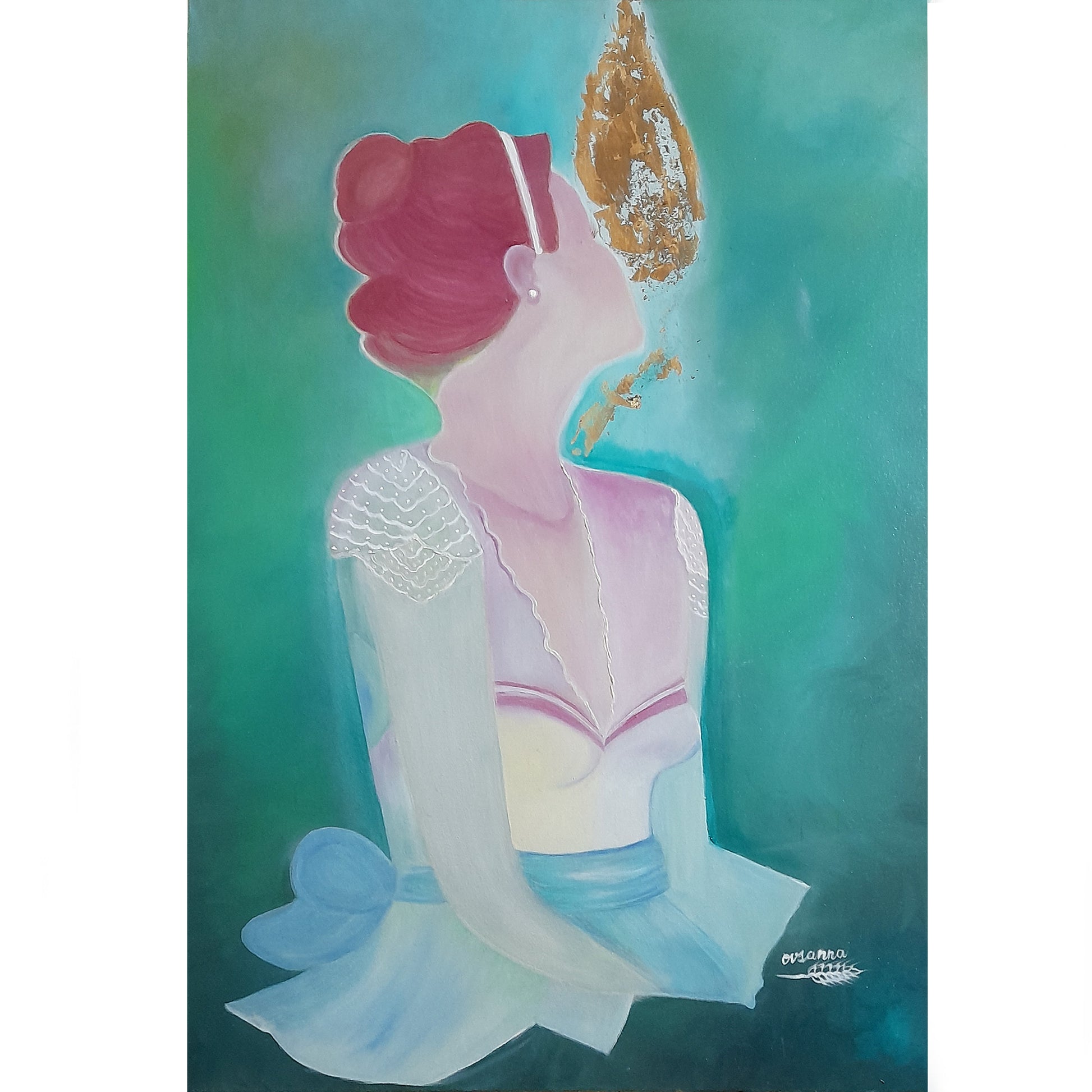 This painting depicts a young woman seated gracefully with her back turned to the viewer, conveying quiet contemplation and refined elegance. Her flowing attire, delicately detailed and luminous, emphasizes timeless grace and beauty, providing a gentle contrast with the serene natural surroundings. Her relaxed yet poised posture, with her head slightly turned, suggests thoughtful engagement as she observes a butterfly nearby. The butterfly, delicate and vibrant, echoes the girl’s own beauty, forming a symbolic link between her presence and the natural world. She gazes upon it with curiosity and wonder, captivated by its ephemeral nature and delicate movements.