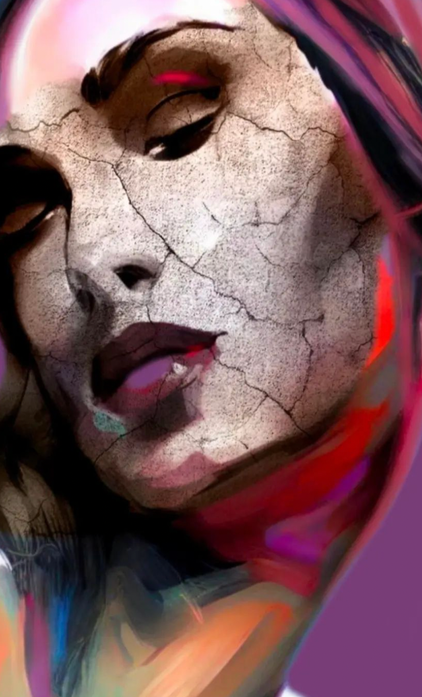 The cracked surface of the depicted face symbolizes the fractured and layered identities of those who, like nomads, move through various landscapes, continually reshaping their sense of self in response to their surroundings. This process is marked by the longing for stability and the inevitability of change, mirroring the lives of many who are displaced or in transition.