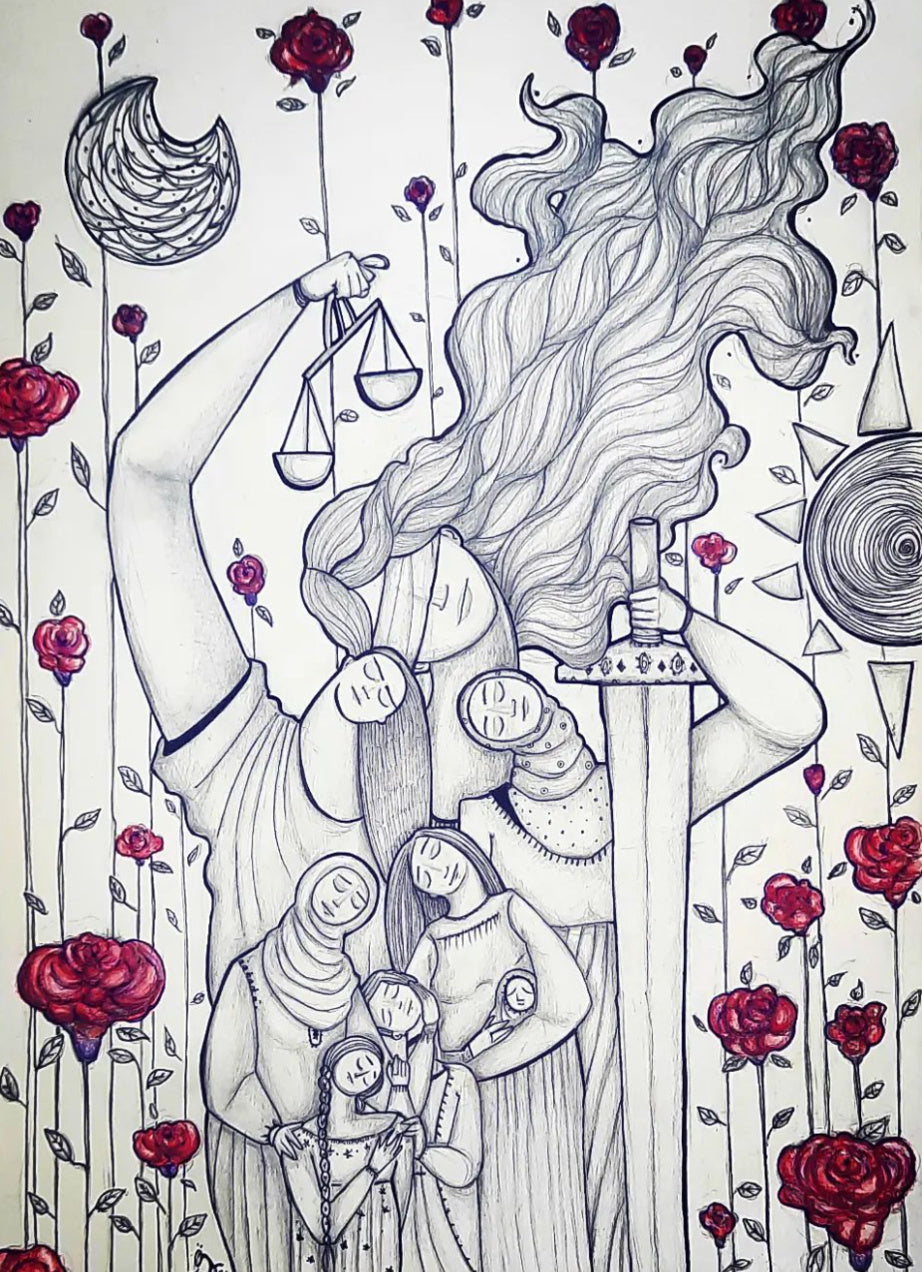 In this illustration, I draw the dream of justice prevailing in the Syrian and Lebanese contexts. It is to bring the perpetrators to international courts so they are held accountable for the misery of many people. I used ink, gray shadings, and red colors on paper.