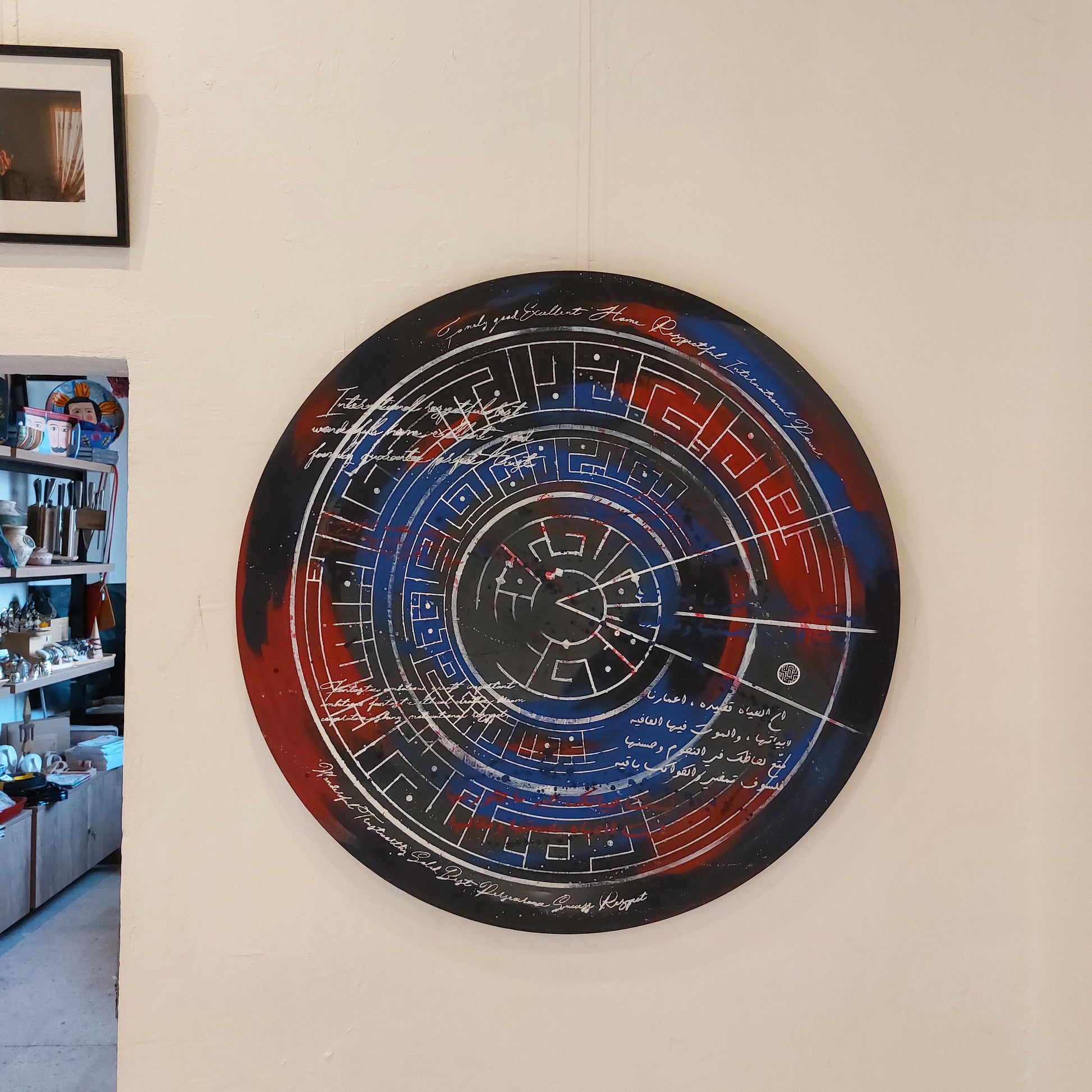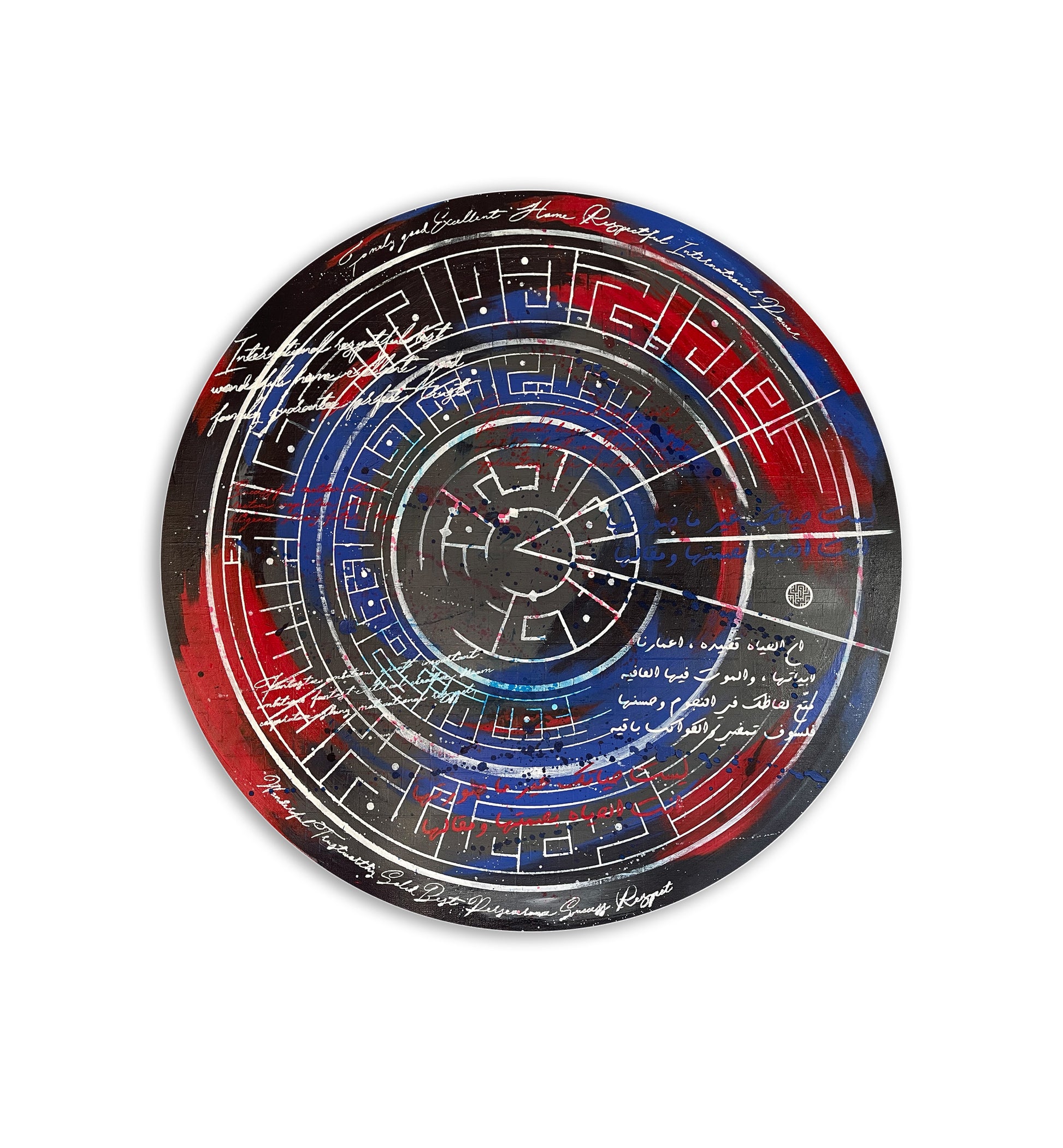 The intricate circular patterns and the structured Kufic script symbolize the cyclical nature of life, echoing the poem’s theme that life is what we make of it—crafted by our actions, thoughts, and silence. The artwork uses bold, cosmic colors of deep blues, reds, and blacks, creating a dynamic contrast that represents the duality of life and death, silence, and expression.