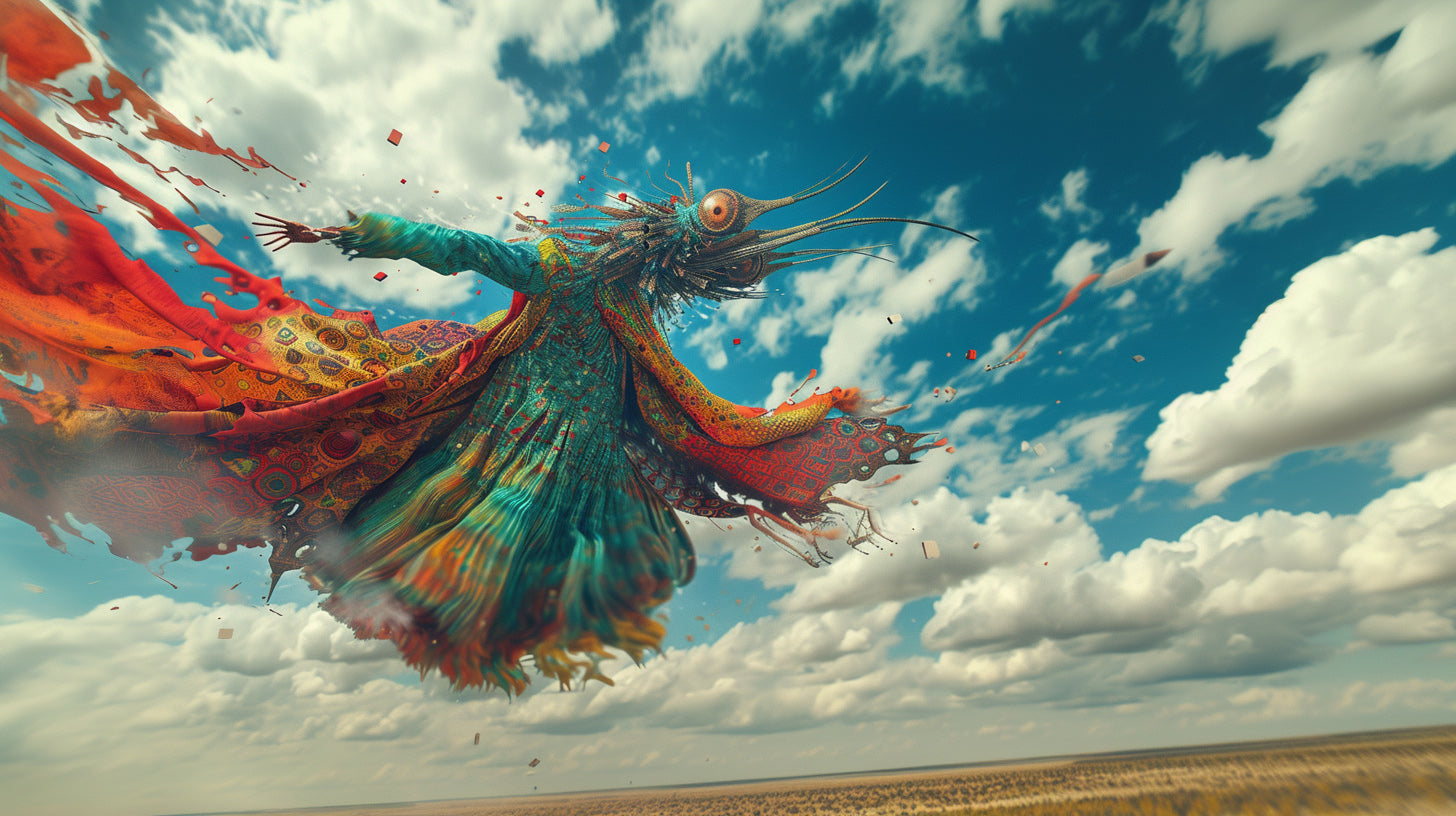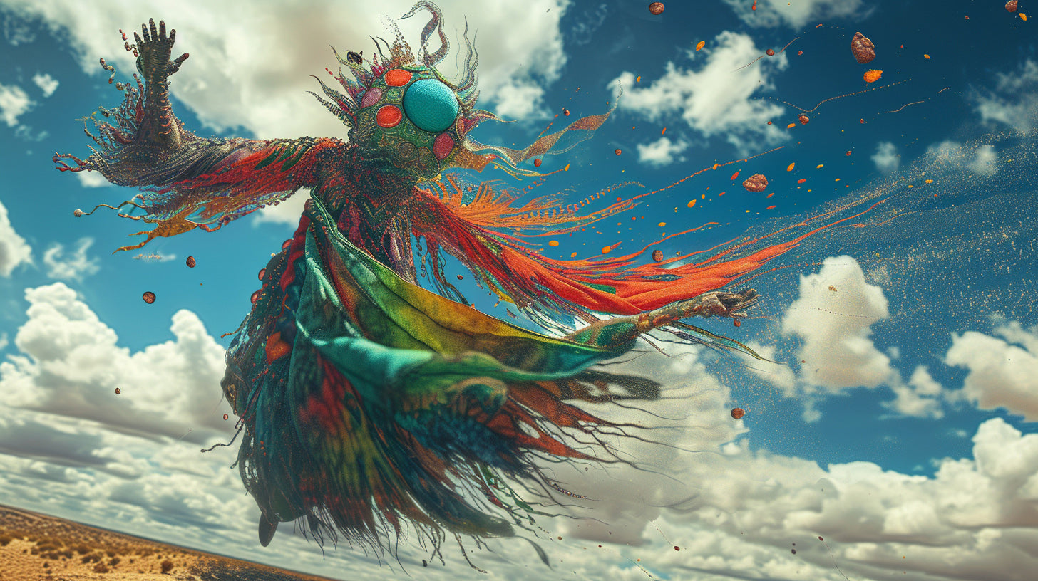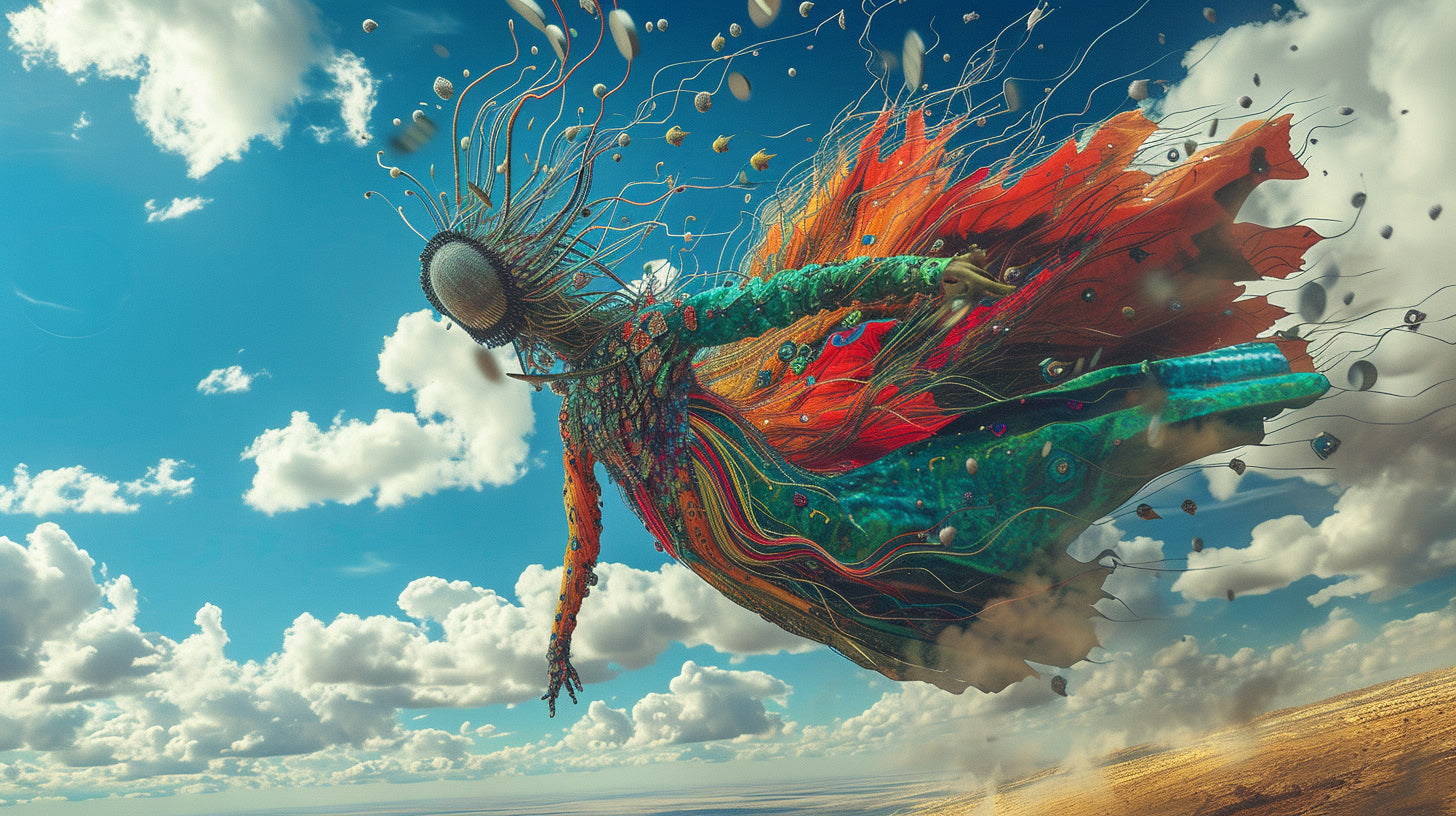 Torn between the winds of entropy and the pulse of reinvention, the body fractures, unspools, breaks free. It is not destruction but mutation, not disappearance but proliferation. What was once solid is now turbulence—skin unraveling into tendrils of something neither human nor machine, neither past nor future, but an alien becoming, an emergence without origin, without end.