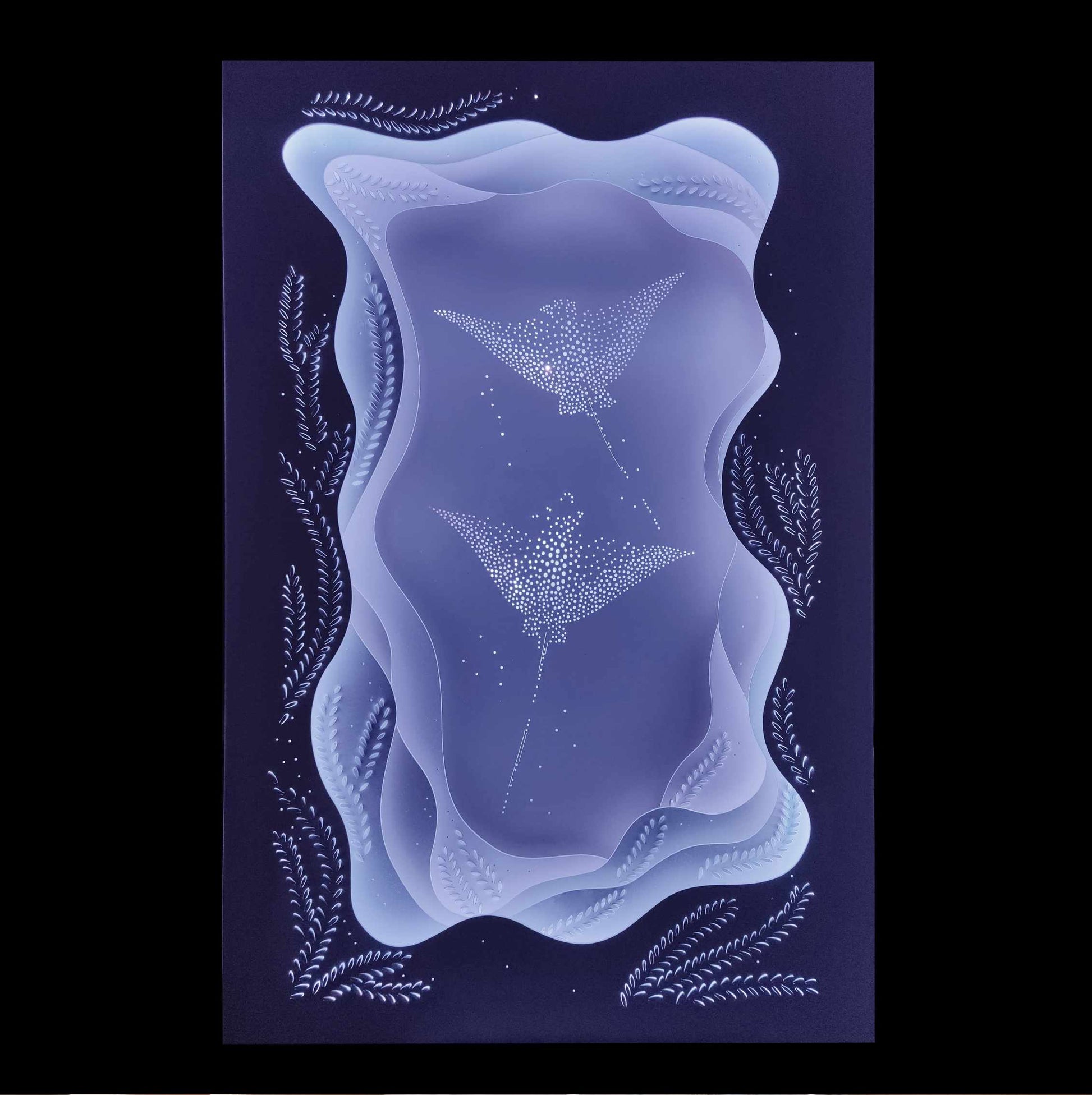 Her work is inspired by the ancient art of paper cutting: the power of turning a simple sheet of paper into a beautiful multi-dimensional scene. The main theme of the artworks is aquatic life, a fascinating yet mysterious world that hides beautiful and powerful creatures who, through their movements that resemble a dance invite us to dive into their domain. The addition of lighting to the artwork gives the piece an enchanting aura that draws the viewer into another level of depth.