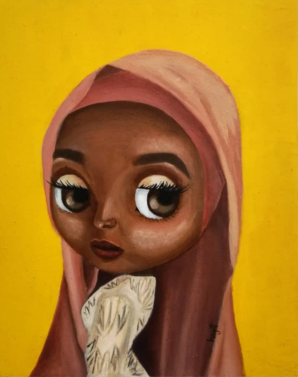 Since taking fiber and textile art classes at the university, the veil has been the main object in Zahraa’s art practice but also a referential attribute for her paintings. Working mainly with painting and drawing, she explores the importance of how dolls can play on one's individuality. Her paintings are deeply inspired by the “big eyes” culture and the aesthetic of cuteness whilst exploring her identity.