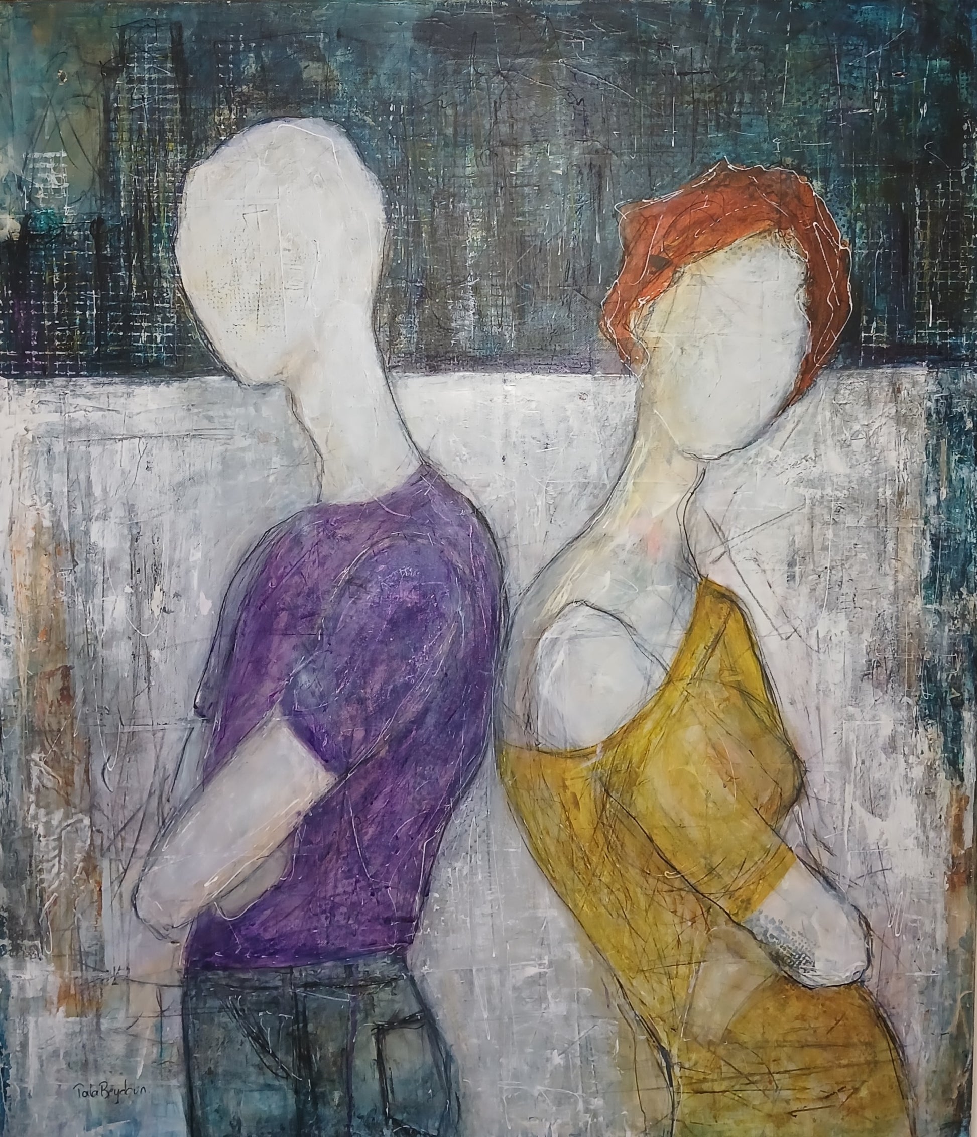 According to the Embodied Realities exhibition's curator Dr. Pamela Chrabieh, "In Not Talking to You, Tala Beydoun captures the silent weight of tension between two figures, their faceless forms turned away from one another in a quiet standoff. The rigid body language and subtle contrasts in color—his deep purple, her golden yellow—suggest unspoken emotions, a moment of disconnection suspended in time. The textured backdrop, with traces of urban structures, situates them in a space that feels both intimate and distant, as if their silence echoes through the fabric of the city itself.