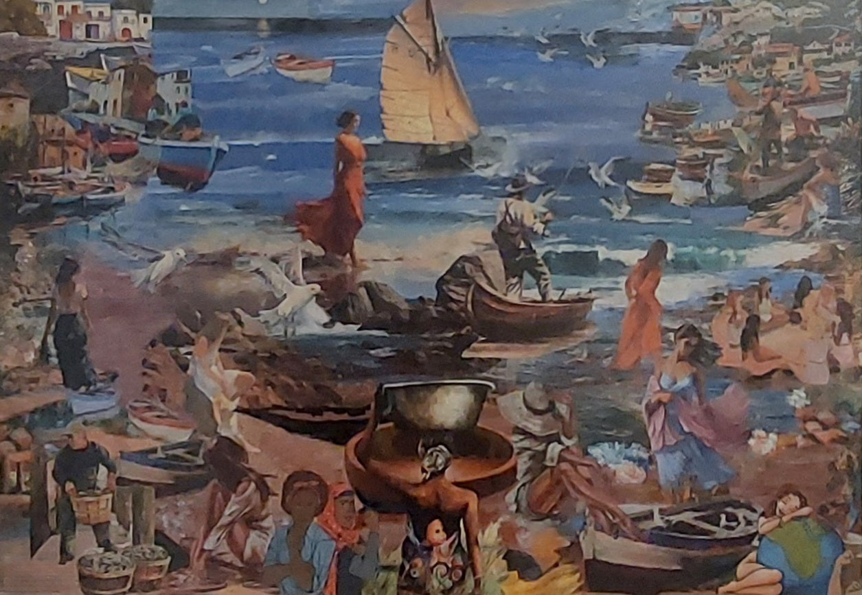Her mediums are paper and glue, but the substrate could be anything – canvas, paper, cardboard, porcelain, glass, wood, or an object with a silent meaning…. She likes to use printed material for the images—somebody’s art – to be reused in a new venue. One particular image is the seed from which, one clipping at a time, a scene evolves to merge colors, style, people, things, and memories and bring life to her collages.