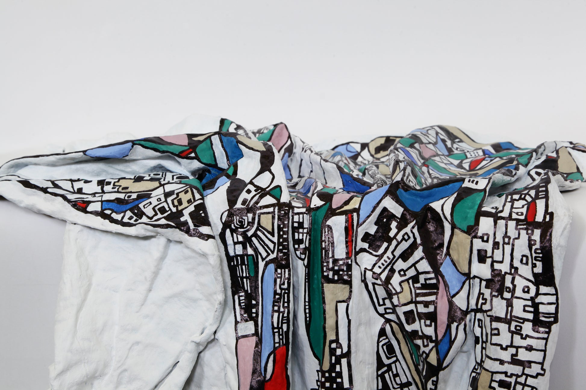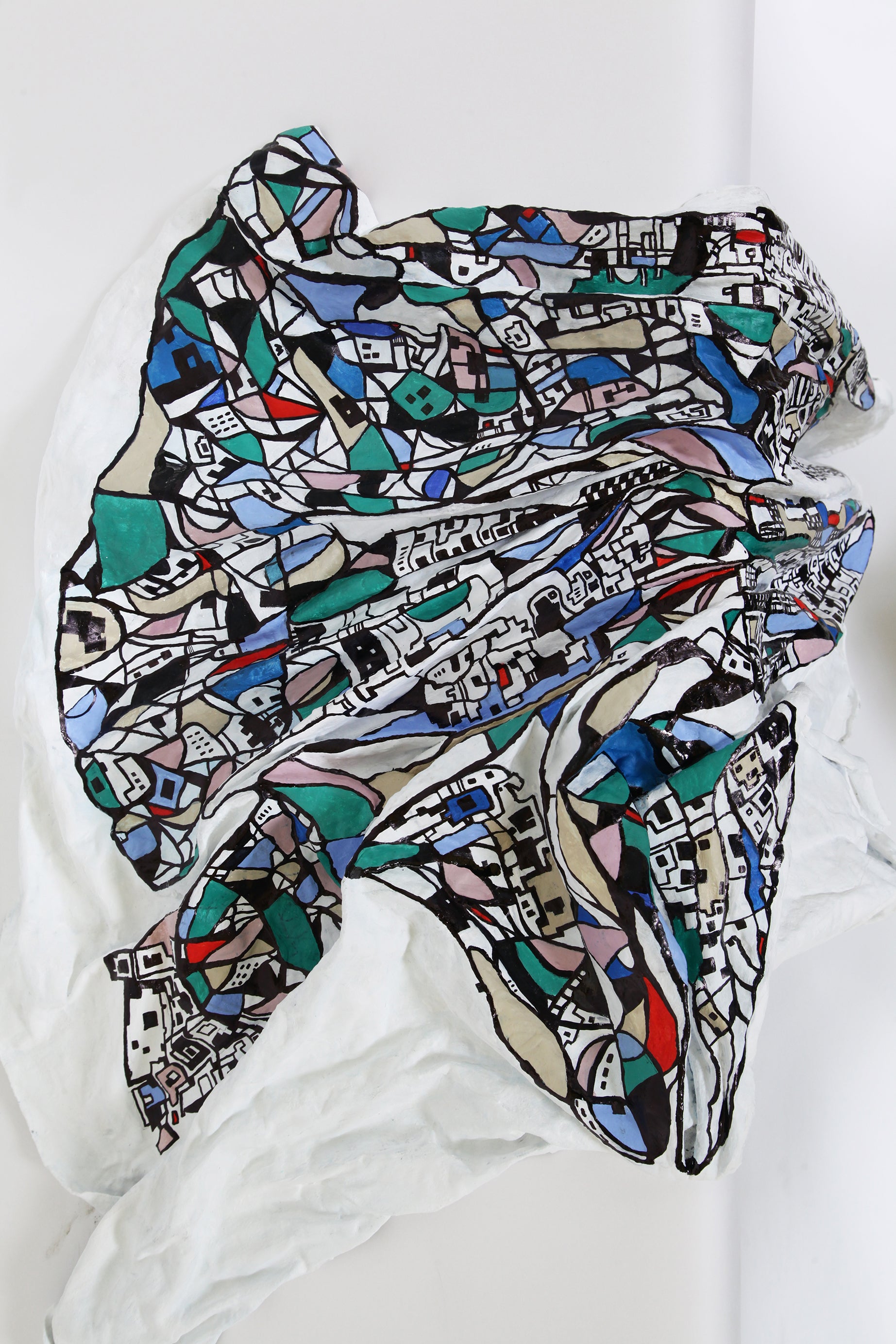 Ode to a Mother is among a series of non-conventional format paintings I’ve made to revisit traditional mounted canvas’ paintings on wood and bring three-dimensional fluid forms into my art. On a white drapery canvas, I painted the continuous symbiotic process of love and the birth of a crumbling city with a tortured past that keeps inspiring me, Beirut. I redrew my visual memory of places I’ve been and streets I’ve walked, projecting forward and backward at once, to reimagine my city beyond the atrocities of wars and political unrest.