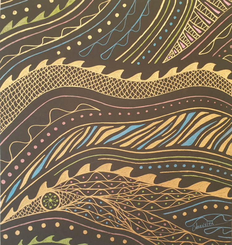 Drawn on black cardstock using neon and metallic ink markers, the works develop intuitively, through rhythm and repetition. Lines accumulate slowly, forming patterns that evoke movement, light, and organic growth.