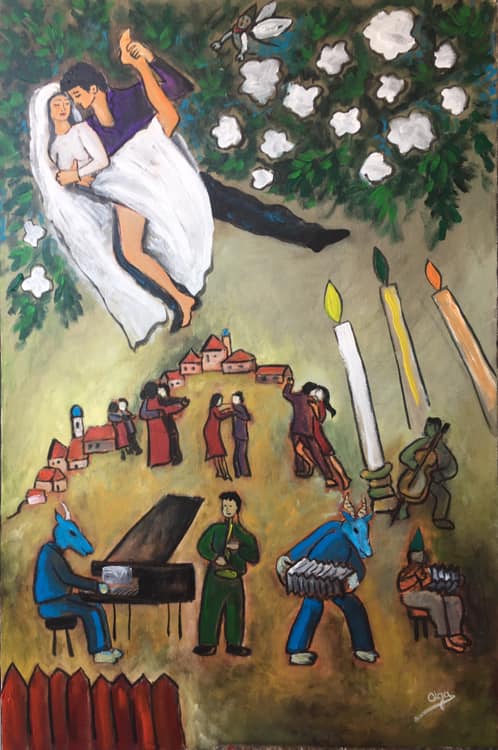 Olga Safa’s Over the Milonga is a striking homage to tango, infused with the dreamlike qualities of Marc Chagall’s artistry. Inspired by Chagall’s floating figures, surrealist compositions, and symbolic animal-headed characters, Safa reimagines the milonga as an otherworldly celebration of movement and transformation. The presence of blue-headed figures evokes themes of metamorphosis, suggesting that dance transcends the physical realm, becoming a medium for self-expression, emotion, and mythology. With a vivid color palette and ethereal forms, the painting invites viewers into a realm where the body is both weightless and deeply expressive, embodying the essence of tango as a dance of passion, connection, and fluidity.