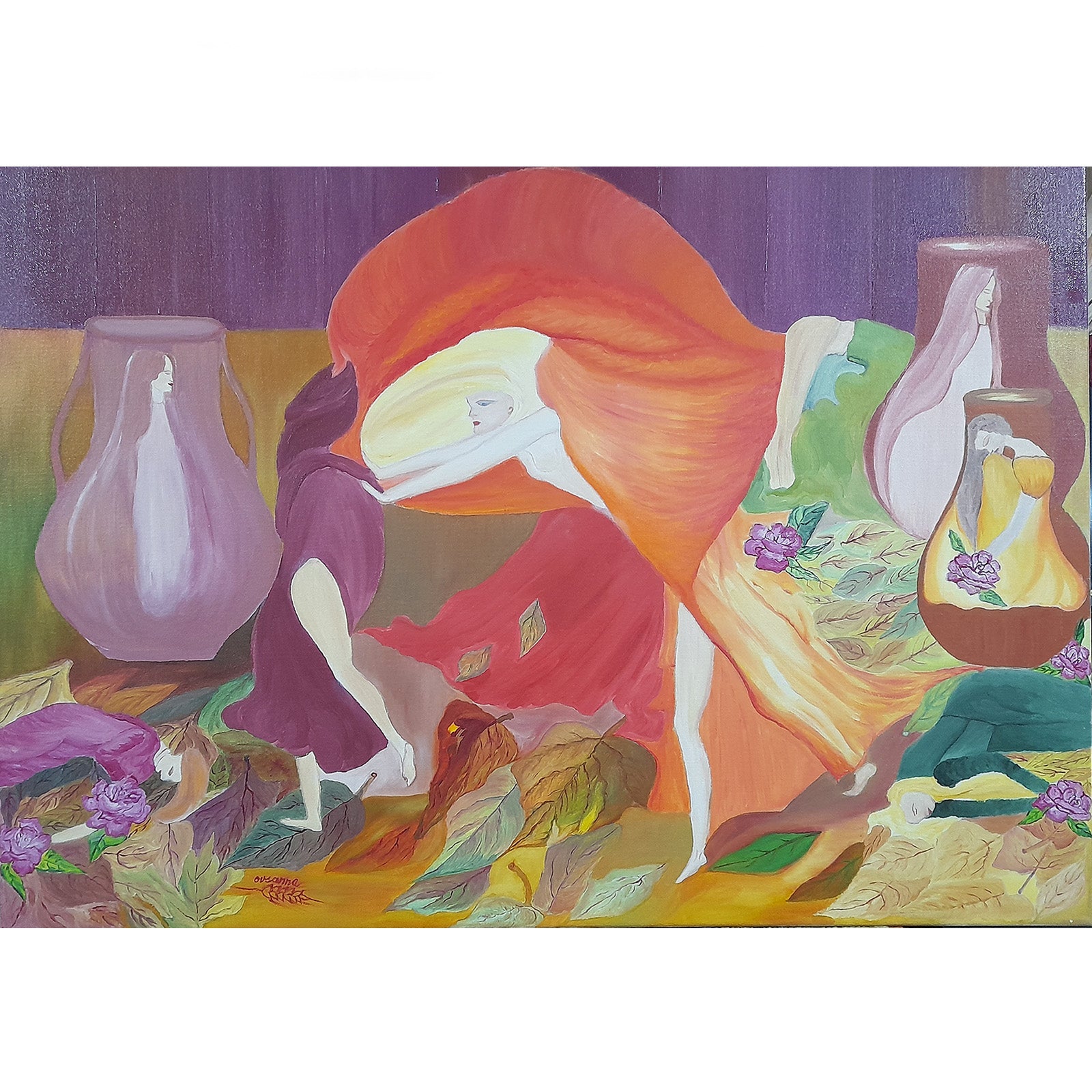 This painting presents a vibrant and dynamic composition depicting several female figures engaged in fluid, expressive movements. Each woman is draped in flowing garments that gracefully swirl around her, accentuating the natural rhythm and elegance of the human form. The bodies are illustrated in diverse postures—some extend outward in gestures of connection, others gently bend or recline amidst vividly colored leaves. The richly textured vases and complementary hues in the background enhance the depth and visual complexity of the scene. The stylized representation of these women's bodies conveys a broad spectrum of emotions and interactions, highlighting themes of unity, nature, and embodied expression.