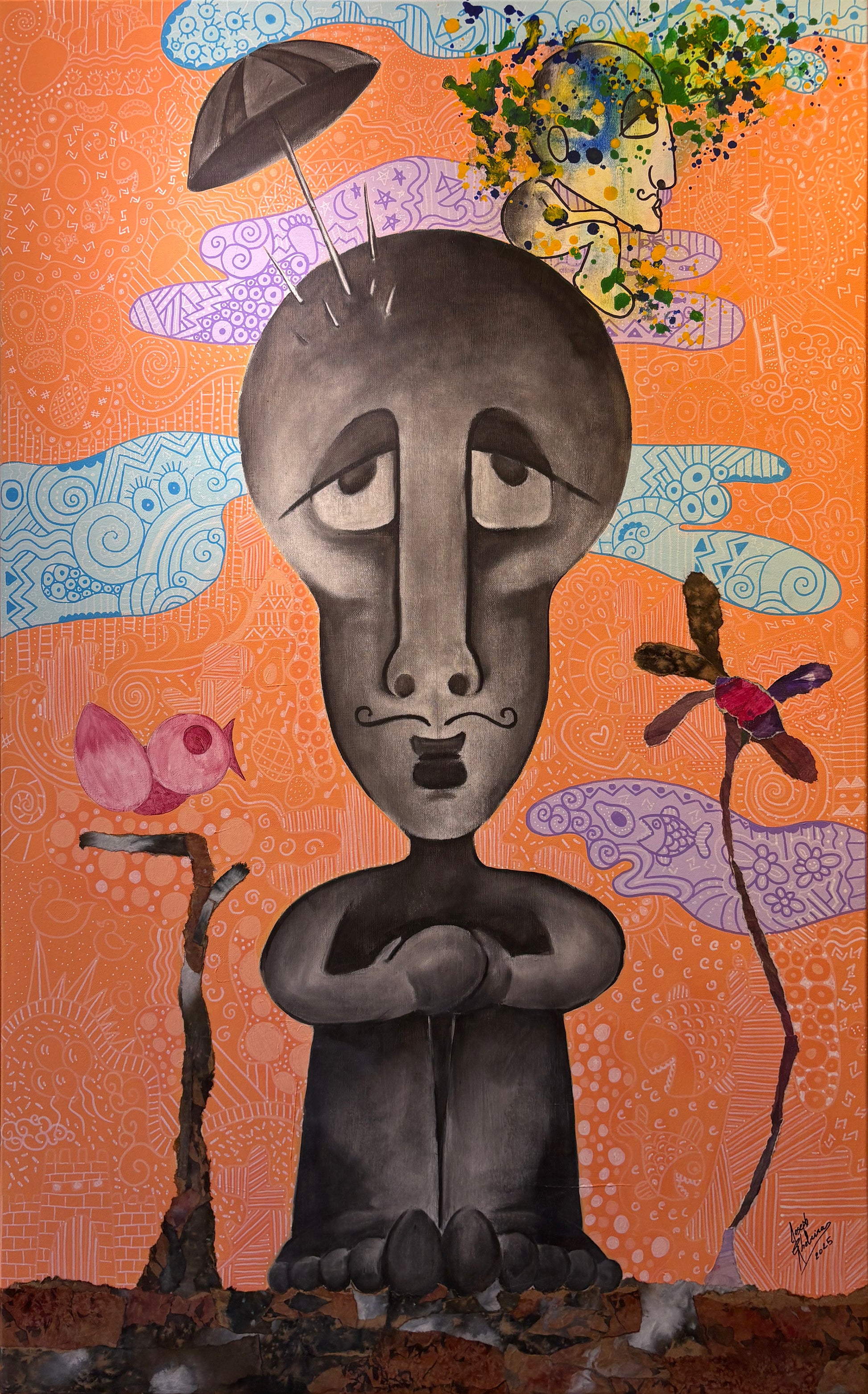 His work spans painting, tattooing, and mixed media, characterized by bold colors and surreal, expressive styles. Through hybrid figures, such as half-human, half-tree beings and human-headed birds, Joseph explores themes of rootedness, emotional liberation, and transformation. His use of drawing, inks, acrylics, and collage creates layered compositions that reflect the tension between confinement and freedom, inviting viewers into a world where human form and nature intertwine.