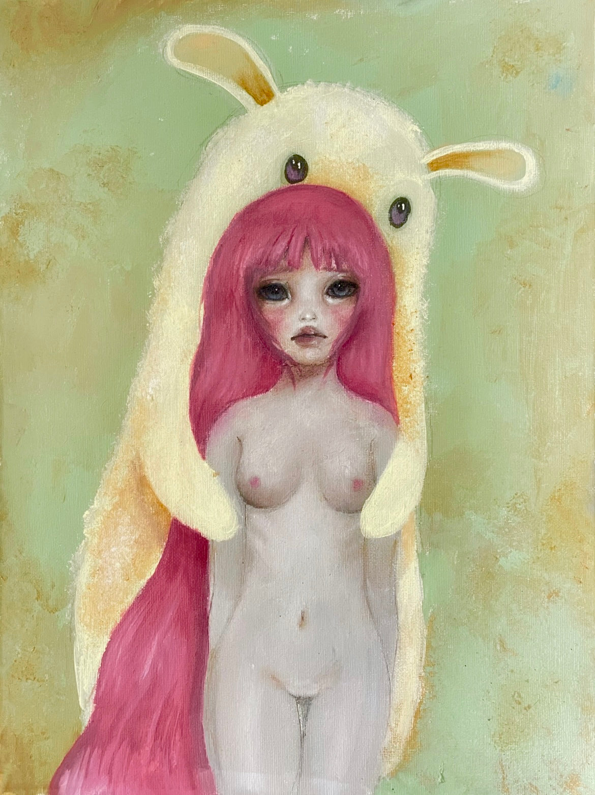 In the haunting masterpiece "Silent Manipulation", an evocative portrayal unfolds a nude girl stands vulnerable, ensnared by an enchantingly malevolent plushie figure. The soft facade of the plushie conceals the embodiment of inner voices and demons, a seemingly innocent companion wielding control. Its grip on her back signifies the unseen forces that manipulate and restrain her, blending innocence with a sinister undertone.