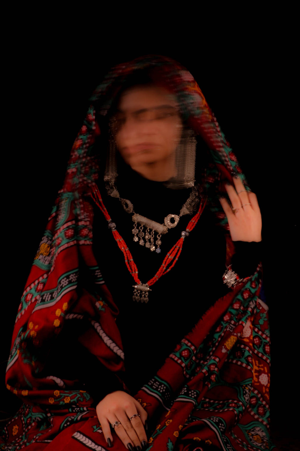 A young girl adorned in the Al-Sitarah, a traditional Yemeni costume worn by women for modesty, gazes into the camera. With old-fashioned jewelry complementing her attire, she directs a look of frustration and rejection toward her surroundings, subtly turning her head to the left.