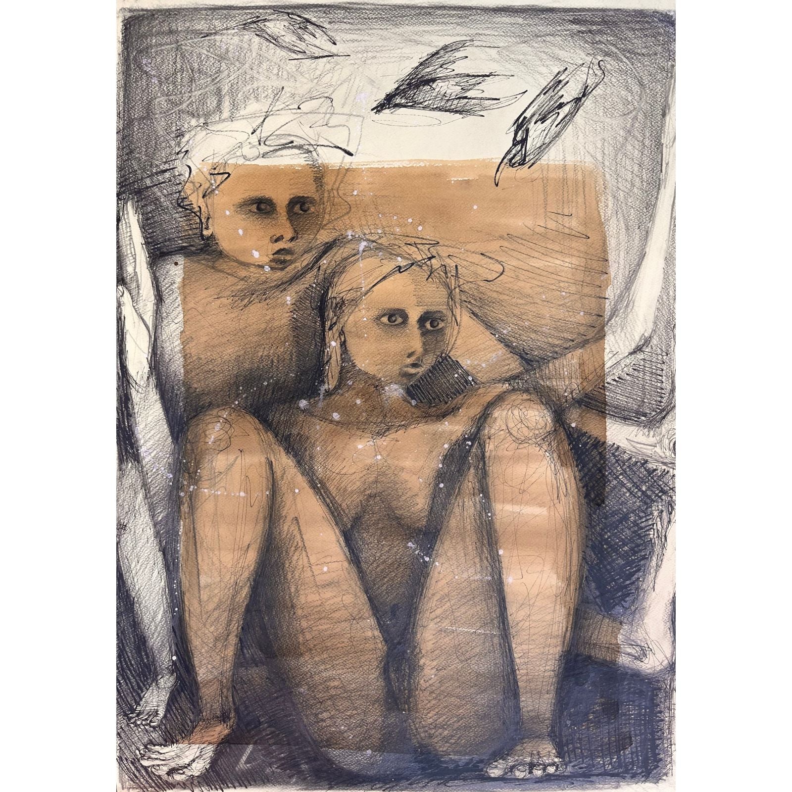 This piece captures the feeling of being trapped, physically, emotionally, and mentally. The two figures appear pressed against an invisible barrier, their expressions tense and uncertain. Imprisoned, as if they are trying to push through but remain stuck. The sketchy, raw lines add to the sense of struggle, making the space around them feel tight and unescapable with bird illustration representing the aimed for freedom.