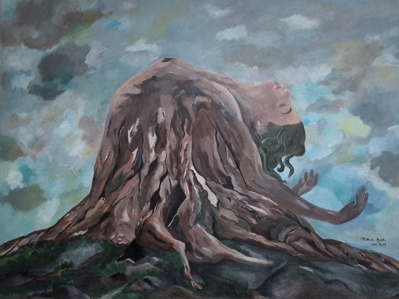 terrifying yet exhilarating! Maria constantly pushes through that moment to create figurative, abstract, and intuitive art. She is inspired by Nature, the unconscious mind, and psychoanalysis, which is her main practice. She captures intuitively the human form and its features, which she discerns within real-life trees, and lets the elusive-to-the-mind unfold freely in pure abstraction. She draws with inks and acrylics on paper, canvas, and wood.