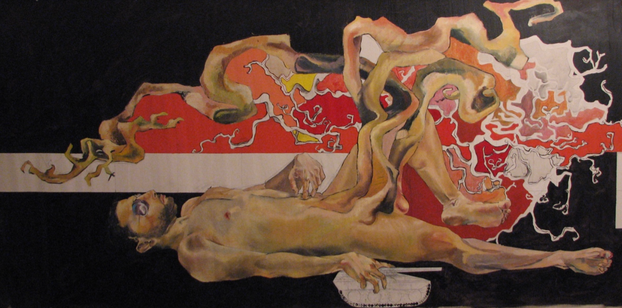 According to the Embodied Realities Exhibition's curator Dr. Pamela Chrabieh, "Jeanne d'Arc Bou Younes’ artwork is a visceral exploration of the male body, power, and vulnerability, presented through a surreal and fragmented lens. The reclining figure, intertwined with fleshy, tree-like appendages, evokes themes of masculinity as a force of nature and a battlefield of identity, desire, and struggle. The raw, organic forms extend beyond the body, merging into tangled roots and abstract explosions, suggesting a confrontation between the physical and the metaphysical—between history, memory, and transformation.