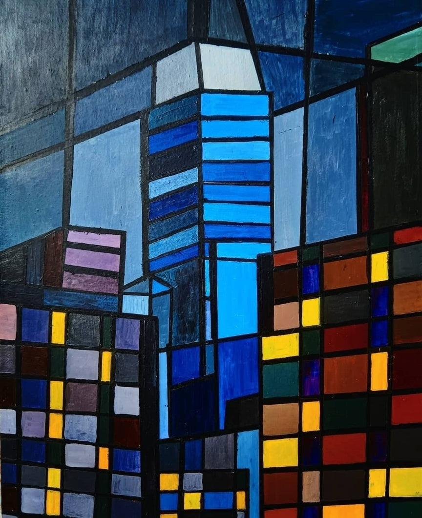 The painting's use of simple geometric forms and non-illusionistic space echoes the Cubist tradition, further emphasizing the tension between the city's architectural grandeur and the environmental degradation it incurs. Al Sahily's composition serves as a visual critique of how the artificial glow that once symbolized progress now contributes to the decomposition of our urban landscape, subtly urging viewers to reconsider the cost of such dazzling displays.