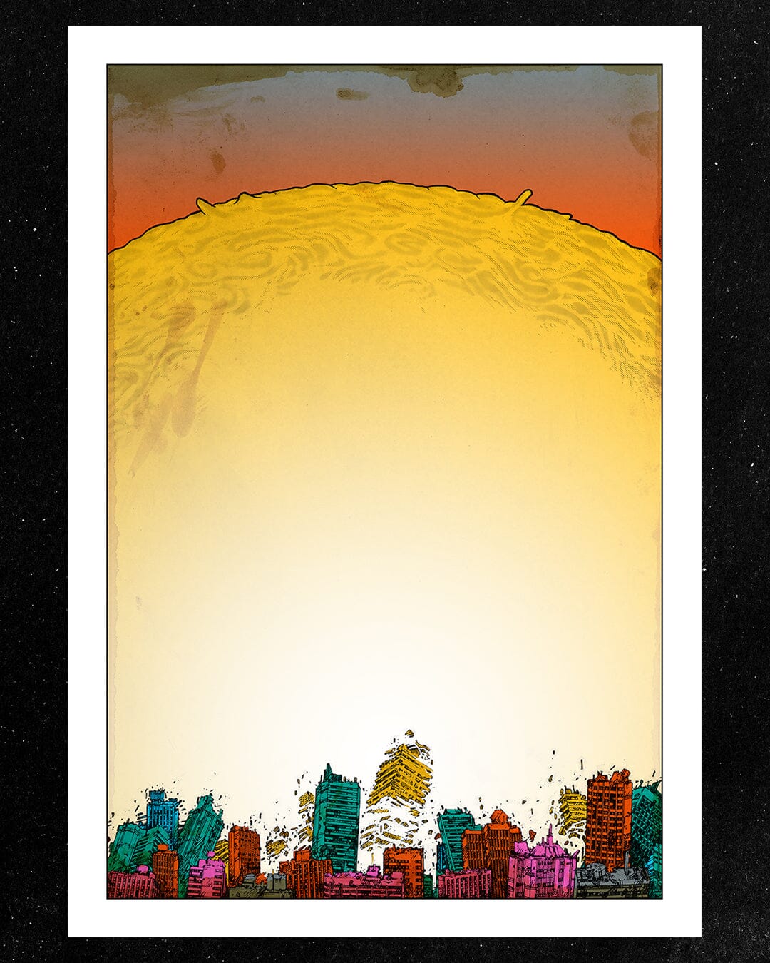 The oversized blast vaporizing the cityscape in its expanding wake colorized non-representationally to evoke conflicting feelings in the audience. Compositionally too, the blast isn't as evident, leaving a mostly haunting empty space in the middle of the piece, allowing contemplation.