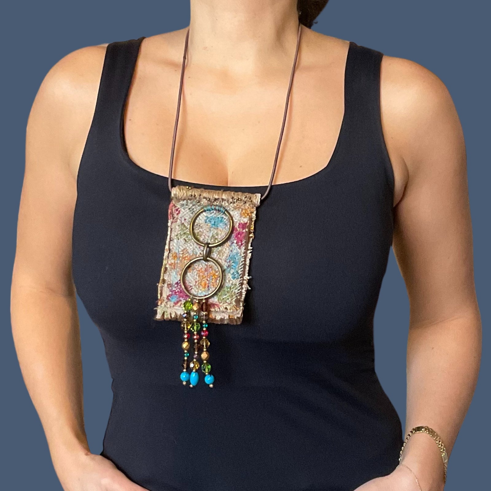 Tala's creative process is fueled by human emotions. She intertwines hand embroidery with machine stitching, utilizing fabrics, yarns, threads, treated papers, hardware, acrylic paint, china ink, and other mediums. This amalgamation results in her unique, upcycled wearable art pieces, which encompass pendants, earrings, necklaces, and paintings.