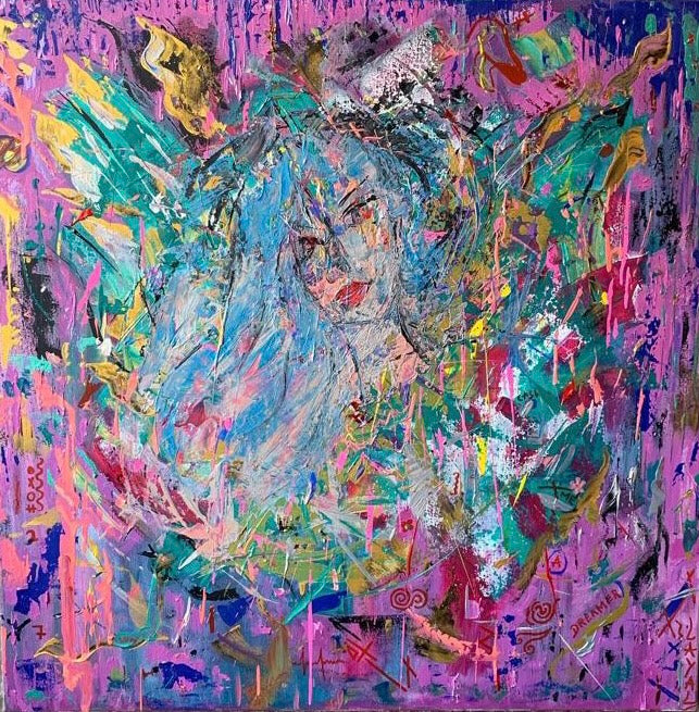 In 2017, she felt some hesitance in taking on this new path but persisted anyway. She started with a few canvases and paints and promised herself to find liberation in this new path. This was her way to speak freely and connect with the world. She has not stopped since. It allows her to express her feelings most sincerely. After a one-year painting course at UPT and a graffiti course as well, she got to paint a wall in Ouzai and give color to her city. She now paints from within unguided by rules. Unguided by judgment. She then decides to start with a series of women, abstract portraits of women and calls it The Labeled Woman of our Society. The woman has to abide by rules and guidelines from a very early age. Her whole existence and experiences are ruled by societal boxes. So she decides to free her and represent her. Sheds a light on her. From this comes her first abstract portrait: “The Labeled Woman”. Then “The Labeled Woman - Part Two”. Then abstract expressionism follows too. It feels like there are no boundaries to it. She keeps going and the journey is passionate and surprising. Rewarding and thrilling. This inspired her to create her painting atelier from home, named after her beloved city. Atelier Beirut. This allows her to share her artistic energy with the world.